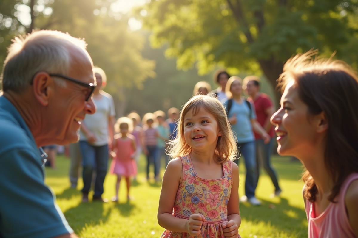 Lors d’une fête de quartier, enfants, parents et grands-parents se rassemblent autour d’ateliers variés. Les plus jeunes découvrent des jeux traditionnels oubliés, tandis que les aînés se familiarisent avec les nouvelles technologies. Ce moment privilégié permet à chaque génération de transmettre ses savoirs et ses valeurs, tissant des liens plus forts entre elles.